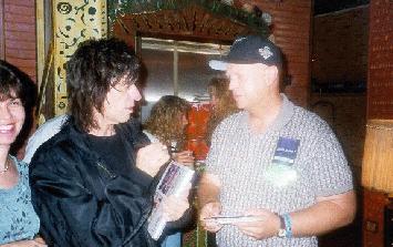 After the show three of my closest boyhood friends and their wives and I headed down towards backstage for our first talk with Jeff since the release of 'Who Else?' and my first ever face to face meeting with Jennifer Batten. Also while waiting to be escorted to the backstage area I also got to meet two other hard core Beck fans, Mike Higgens and Bob Wiesberg, who we've written to for years but never met. Soon we were escorted from the right side of the stage, down a narrow flight of stairs to a smallish room beneath the stage. Every so often you could hear a loud 'bang' overhead as the road crew tore down the stage. First to enter was Jennifer Batten who immediately went over and talked to a group of older people. I think they were members of drummer Steve Alexander's family. After several minutes I caught Jennifer's eye by waving a 'Sharpie' pen and asked her to sign my 'Who Else?' CD. What can I say? She is just a marvelous person, very friendly and humble. I asked her how the tour was going and if she was having a good time. She said, "God! This is a dream, playing with one of my heroes." I told her a liked the Austin Power's 'Oh Behave' during 'Psycho Sam', that movie is great. She said, "Yeah, we watch it a lot on the bus!".